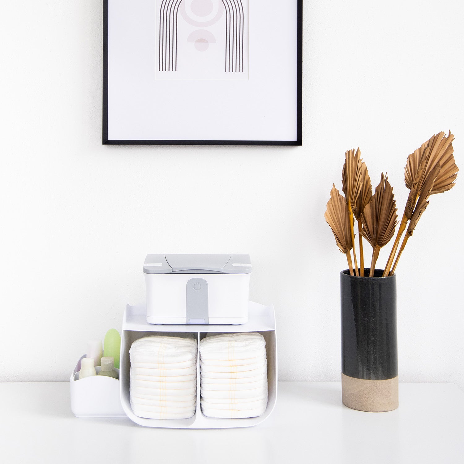 • Almacenamiento conveniente,  para mayor comodidad durante los cambios de pañales; bandeja para calentador de toallitas o dispensador de toallitas.