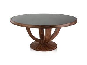 Material del Producto: Mesa de comedor de madera Pau ferrro, sobre de madera laqueada color negro y vidrio.